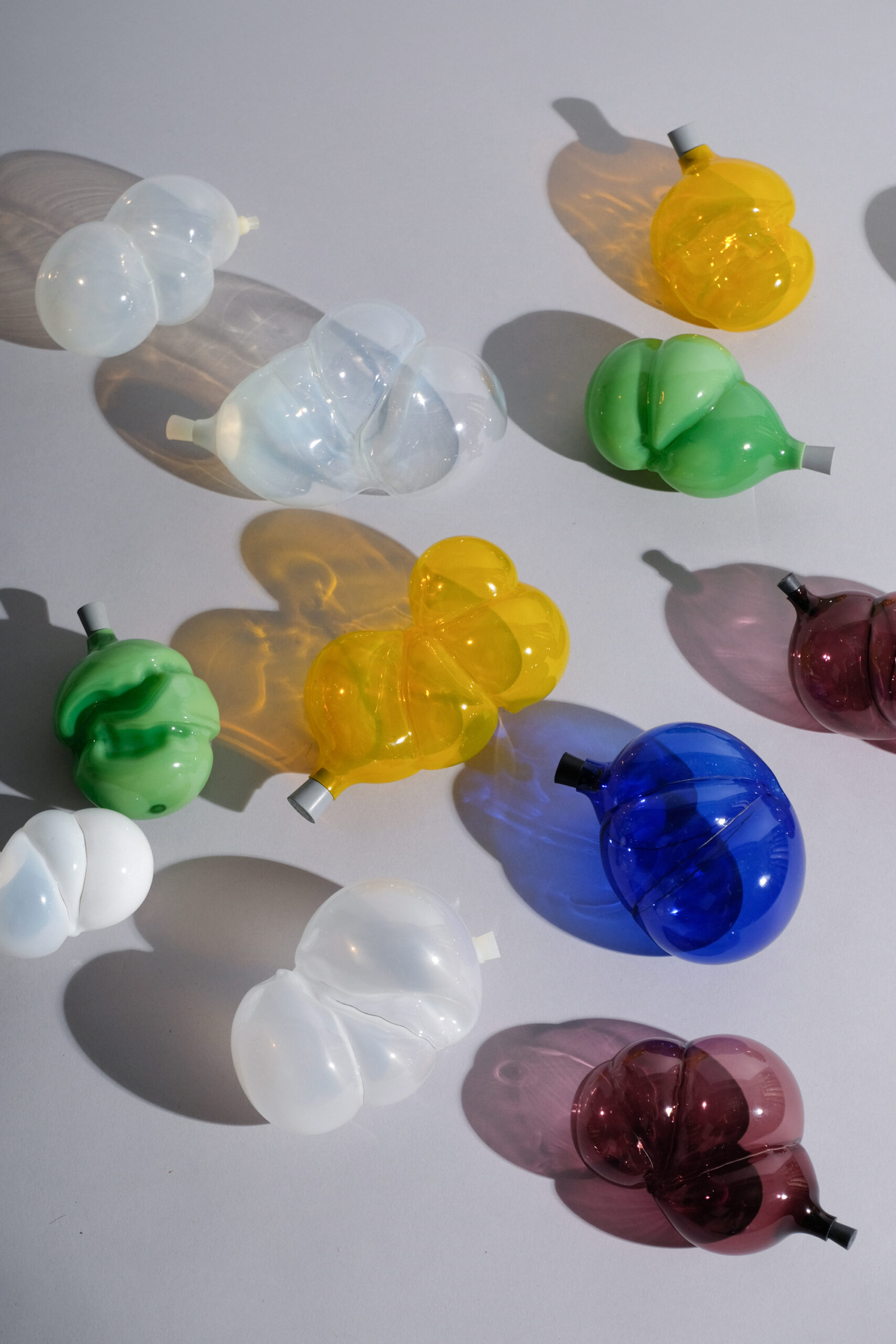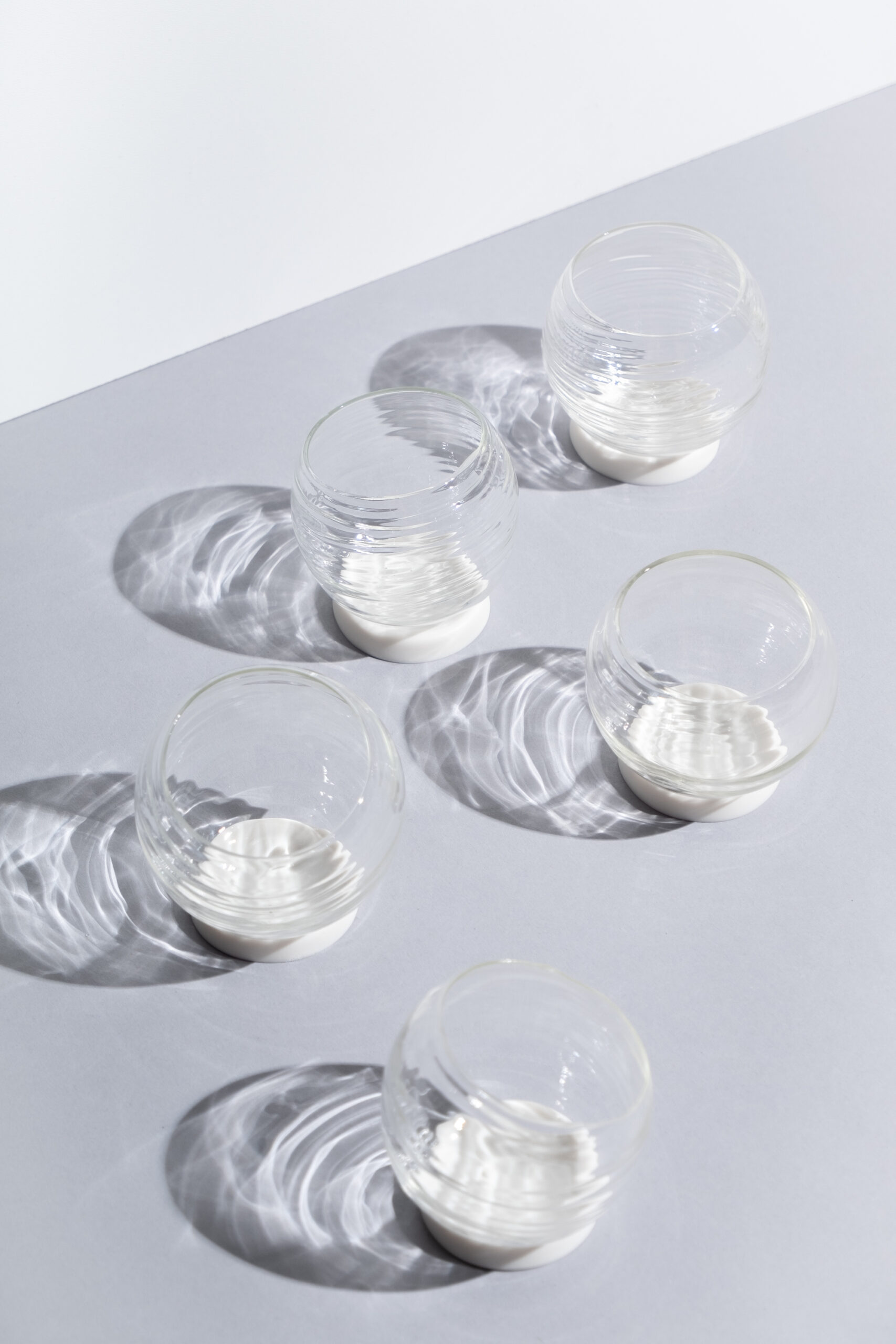 Die Serie präsentiert transparente Trinkgläser in Form von Kugeln. Ihr charakteristisches Licht- und Schattenspiel enthüllt die Art und Weise ihrer Herstellung, bei der das Material in seinem zähflüssigen Zustand Schicht für Schicht aufgewickelt, verschmolzen und anschließend verblasen wurde. In ihrer scheinbar ruhigen Bewegung fangen sie die flüssige Eigenschaft des Materials ein und offenbaren den Moment einer sich bewegenden Substanz. So behalten die Glaskörper die besondere Dynamik bei, die in ihrem Material steckt.